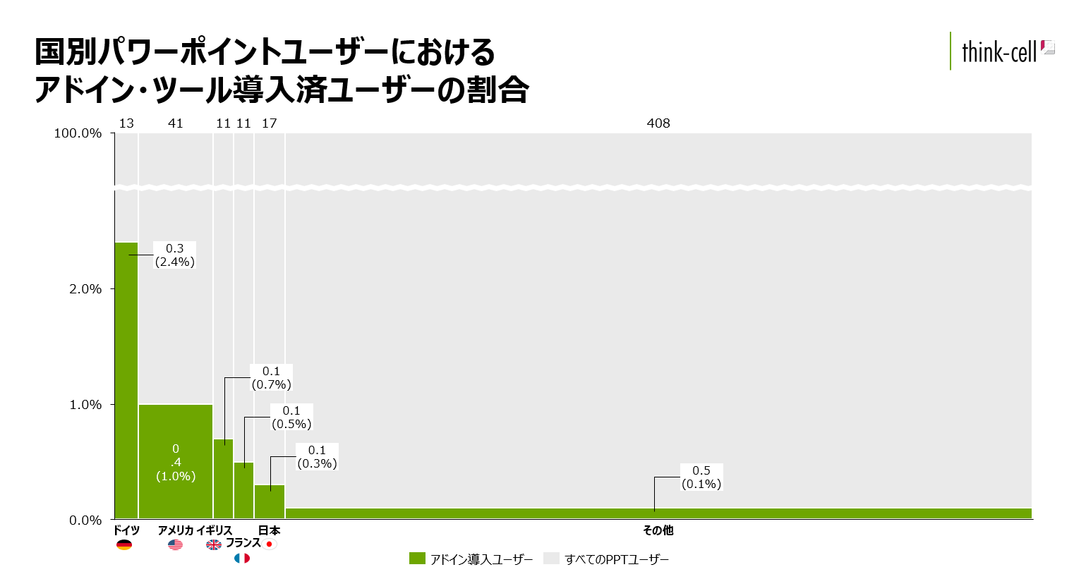 主要5か国中、パワーポイントユーザー全体に対してスライド作成作業を効率化するようなパワーポイントアドイン・ツールを導入している割合は、ドイツが首位でパワーポイントユーザー全体に対して2.4%、次いでアメリカ1.0%、イギリス0.7%、フランス0.5%、そして日本は0.3%となりました。ドイツでは、日本の8倍でパワーポイントユーザーがアドイン・ツールを利用しています。