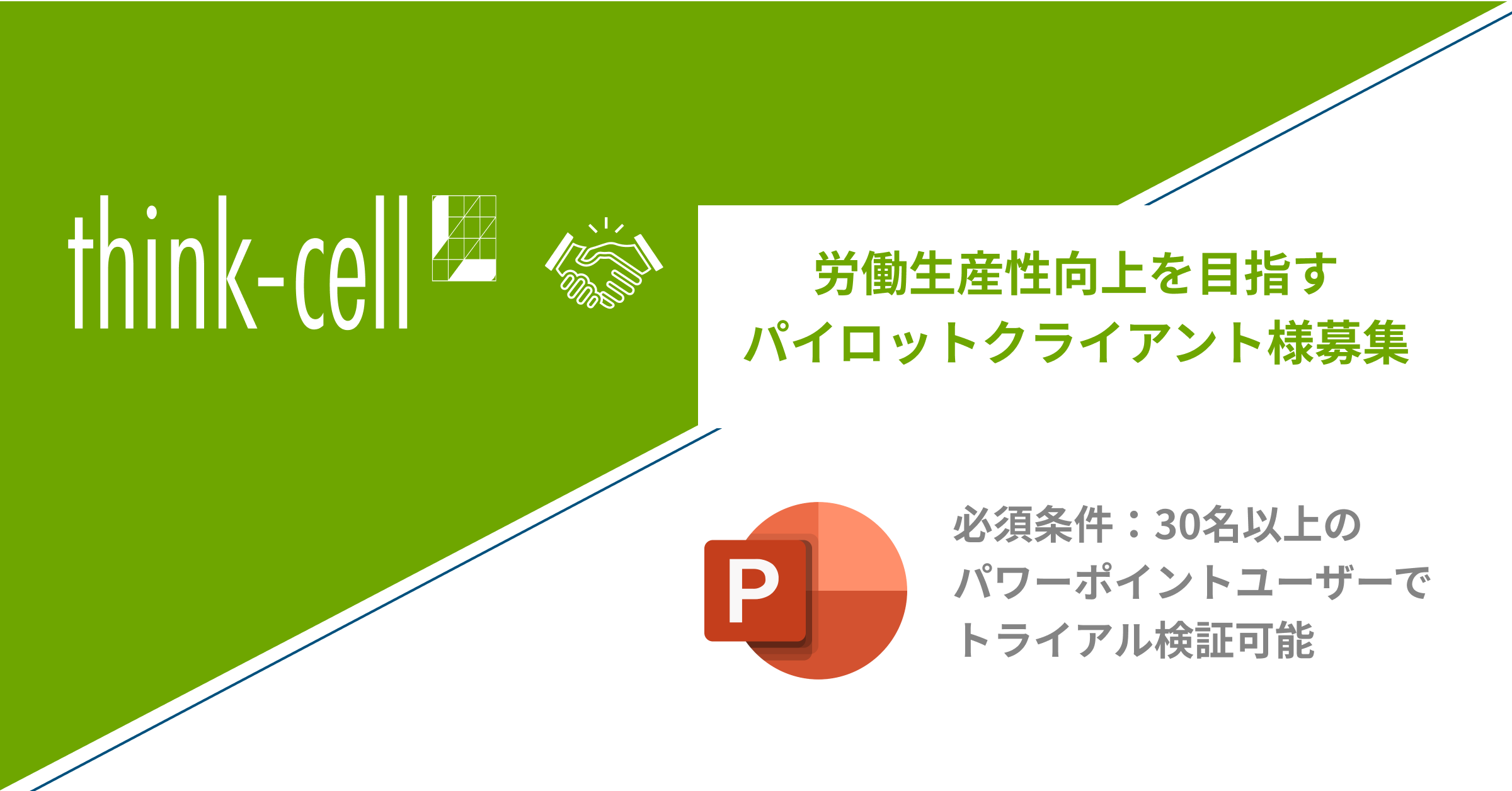 そこで、ビジネスプレゼンテーション資料作成を最大70%削減するパワーポイントアドイン・ツール「think-cell」を提供する think-cell Japan は、最大3か月の無料トライアルを通して、think-cell の導入前後にどれだけ労働生産性に違いがでるかの検証にご協力いただけるパイロットクライアントを2社限定で募集するに至りました。