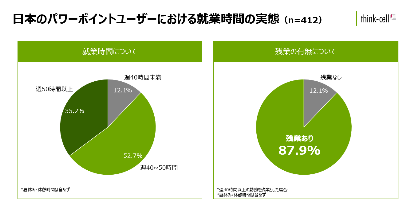 一方、日本のパワーポイントユーザーに就業時間について尋ねたところ、52.7%が「週40~50時間」、35.2%が「週50時間以上」と回答し、結果87.9%が残業をしているという結果でした。