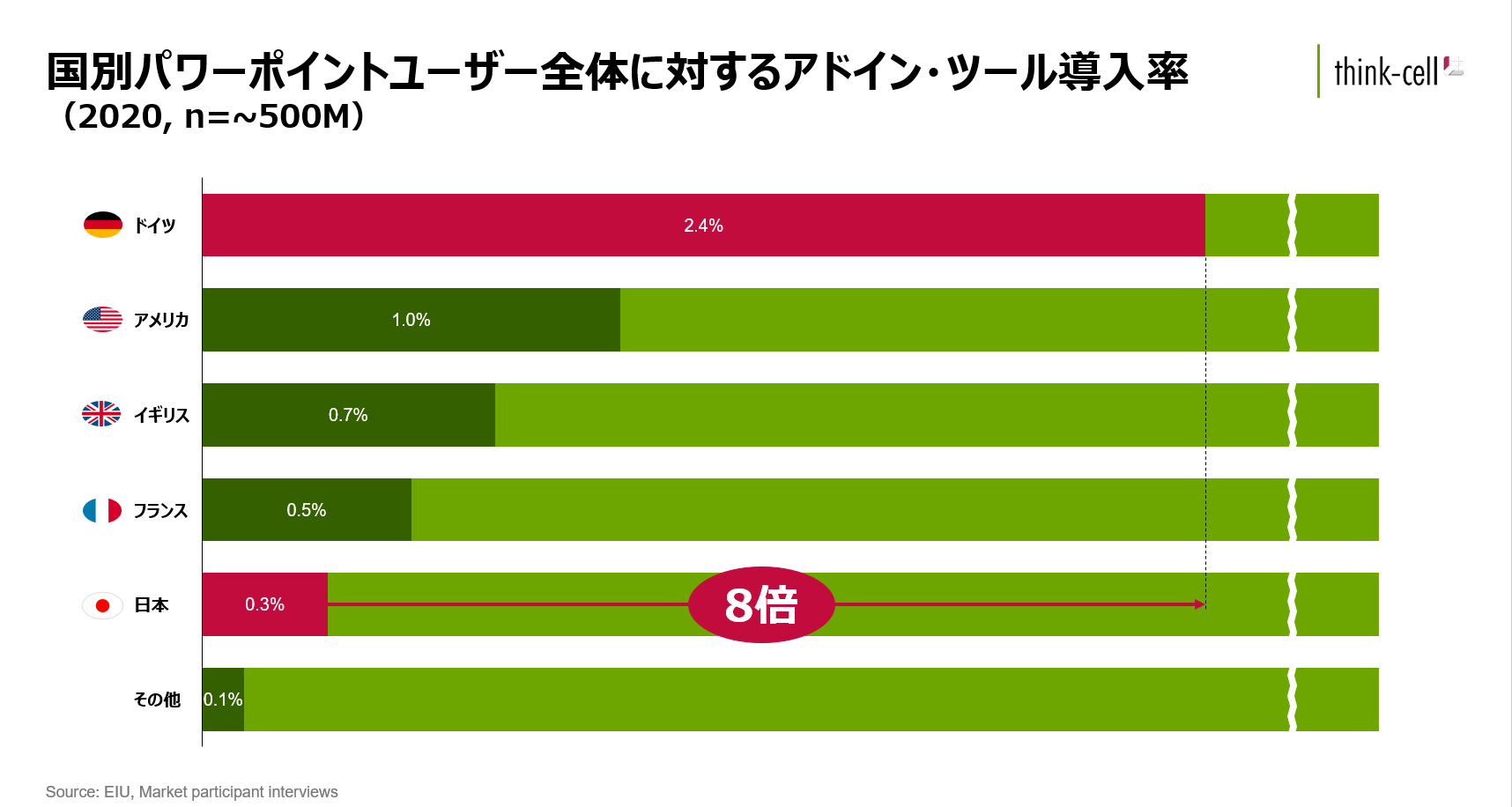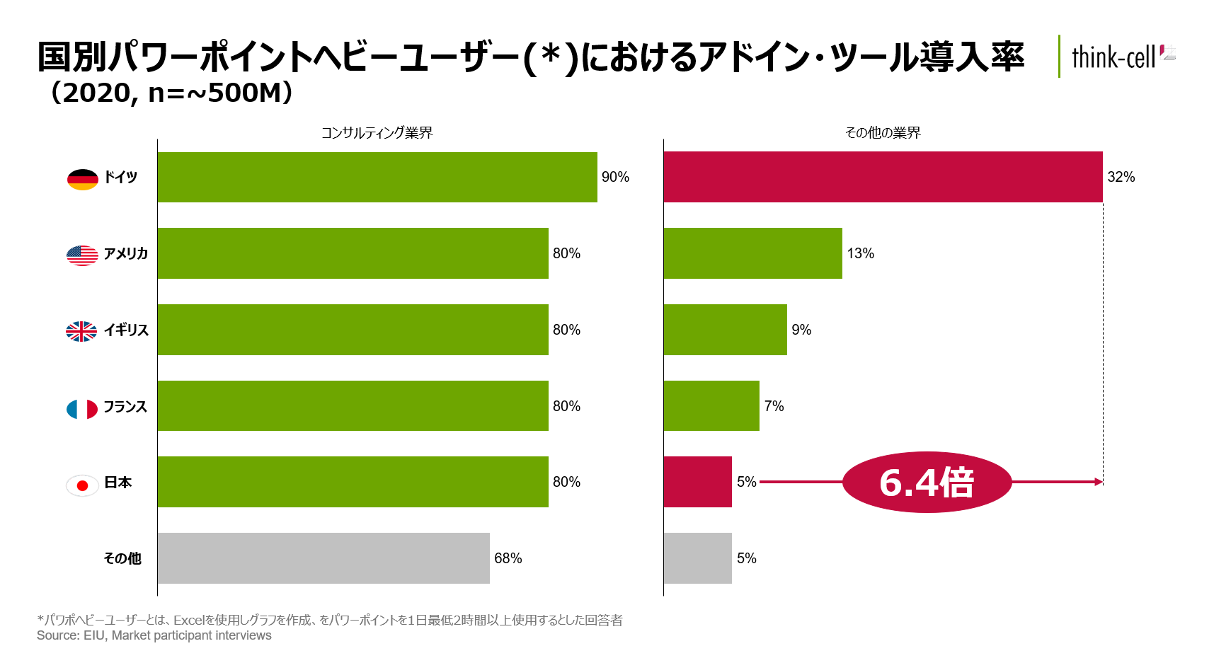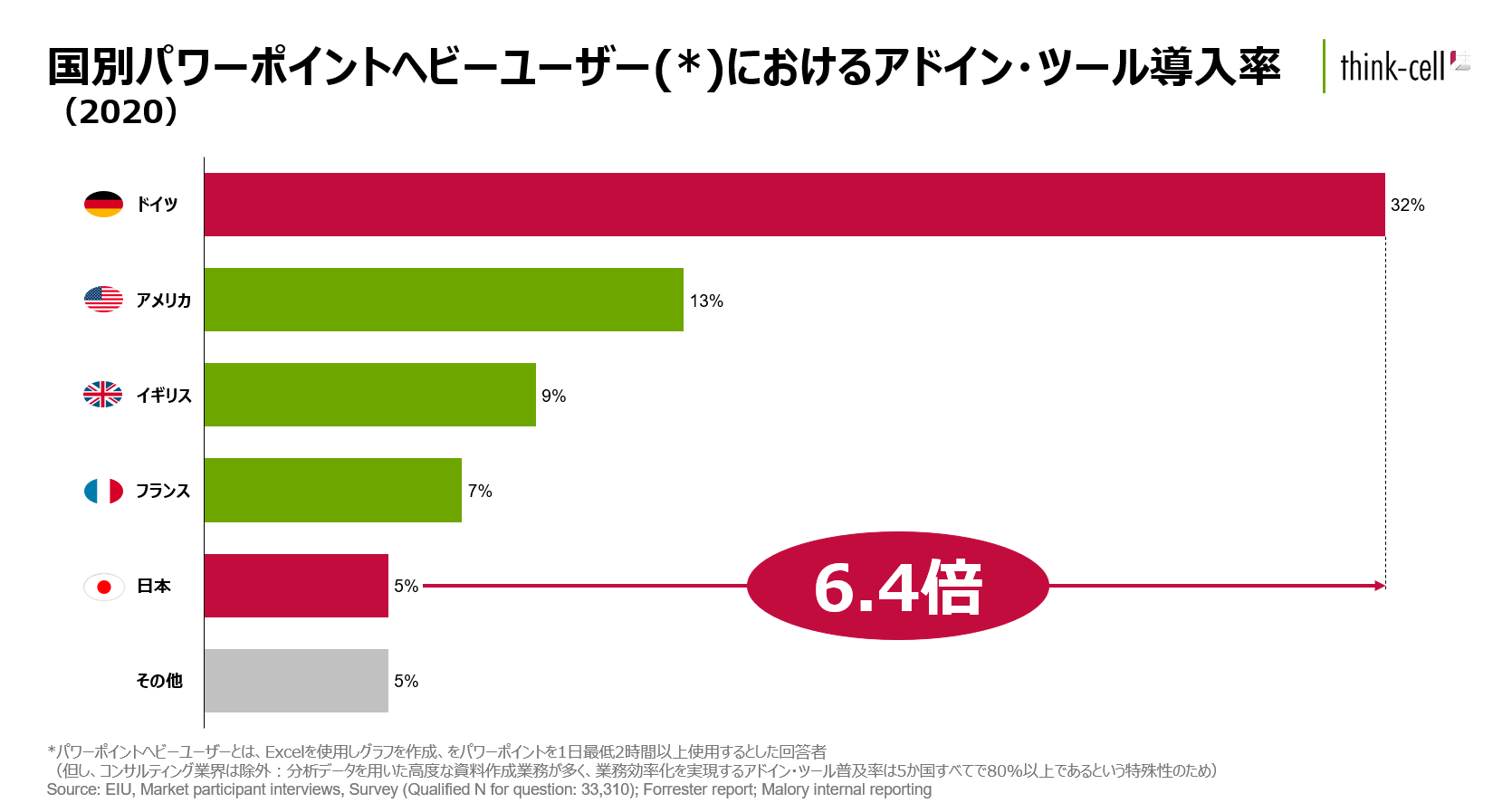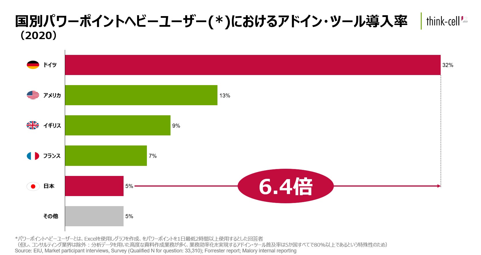 また、「Excelを使用しグラフを作成し、パワーポイントを1日最低2時間以上使用するとした回答者」をパワーポイントヘビーユーザーと定義した場合、パワーポイントヘビーユーザーに対するパワーポイントアドイン・ツール導入率においても、日本が最下位となり、首位のドイツは日本の6.4倍でした。