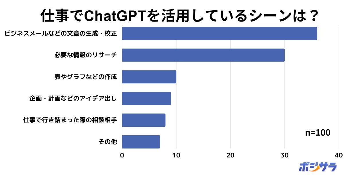 株式会社ACILが運営するキャリア・転職情報メディア『ポジサラ』(https://pojisara.com/)は、全国の20代以上の男女を対象に「仕事でChatGPTを活用しているシーンは?」をテーマとしたアンケート調査を実施致しました。