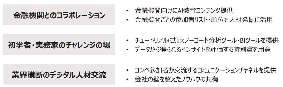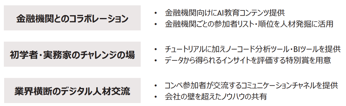 こうした課題を解決するため、参加者同士の横の繋がりを設け、会社の壁を越えたノウハウの共有の機会を作り、金融業界内外問わず人材を育成・発掘することを目的として、当協会ではデータ分析コンペティションを昨年度より開催しております。