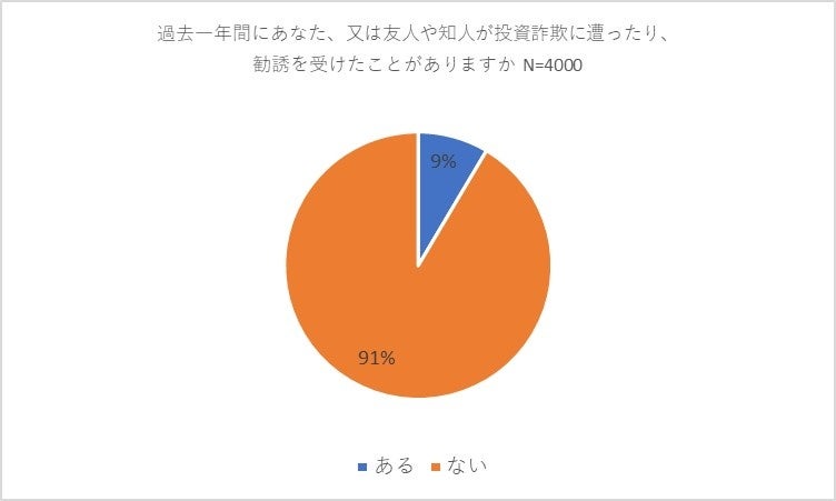 初めに全員に対し「過去一年間にあなた、又は友人や知人が投資詐欺の被害に遭ったり、勧誘を受けたことがありますか」との質問を行いました。その結果、9パーセントの方が「ある」、91パーセントの方が「ない」と回答しました。