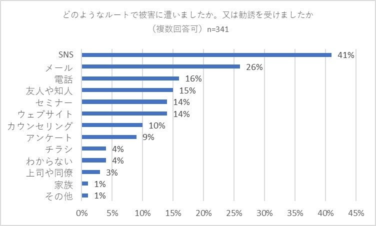 続いて「どのようなルートで被害に遭いましたか、又は勧誘を受けましたか」(複数回答可))と尋ねたところ、「SNS」が41パーセントでトップとなり、2位は「メール」(26パーセント)、3位が「電話」(16パーセント)となりました。それ以下では「友人や知人」(15パーセント)、「セミナー」と「ウェブサイト」(ともに14パーセント)が続きました。ここでは時代を反映してか「SNS」や「メール」が勧誘の主体となっていることがわかりました。