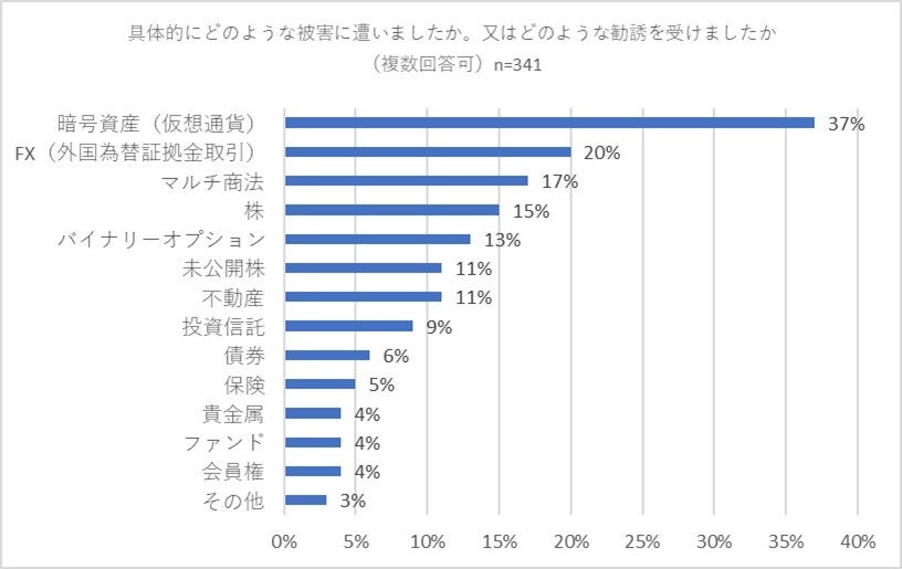 次に前設問で本人、又は友人や知人が投資詐欺の被害に遭ったり、勧誘を受けたことが「ある」と回答した341人に対し、「具体的にどのような被害に遭いましたか、又はどのような勧誘を受けましたか」(複数回答可)と質問したところ、「暗号資産(仮想通貨)」が37パーセントで最も多くの回答を集めました。その次に多かった回答は「FX(外国為替証拠金取引)」(20パーセント)で、3位は「マルチ商法」(17パーセント)でした。それ以下では「株」(15パーセント)、「バイナリーオプション」(13パーセント)、「未公開株」と「不動産」(ともに11パーセント)が続きましたが、「暗号資産(仮想通貨)」の被害や勧誘が頭一つ抜けて目立つ結果となりました。