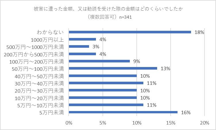 次に、「被害に遭った金額、又は勧誘を受けた際の金額はどのくらいでしたか」(複数回答可))との質問を行いました。具体的な金額が判明している中では「5万円未満」との回答が16パーセントで最多でしたが、「5万円~10万円未満」(11パーセント)を合わせた「10万円未満」で見た場合、その割合は27パーセントと突出した割合となりました。「10万円~50万円未満」を10万円ごとに見ると各解答はほぼ10パーセントの割合となりました。