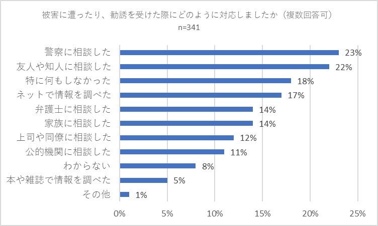 最後に、被害に遭遇したり、勧誘を受けた際にどのように対応したかを複数回答可で質問しました。その結果、「警察に相談した」(23パーセント)と「友人や知人に相談した」(22パーセント)がほぼ同じ割合で多くの回答を集めました。それ以降では「特に何もしなかった」(18パーセント)、「ネットで情報を調べた」(17パーセント)、「弁護士に相談した」と「家族に相談した」(ともに14パーセント)との回答が続きました。