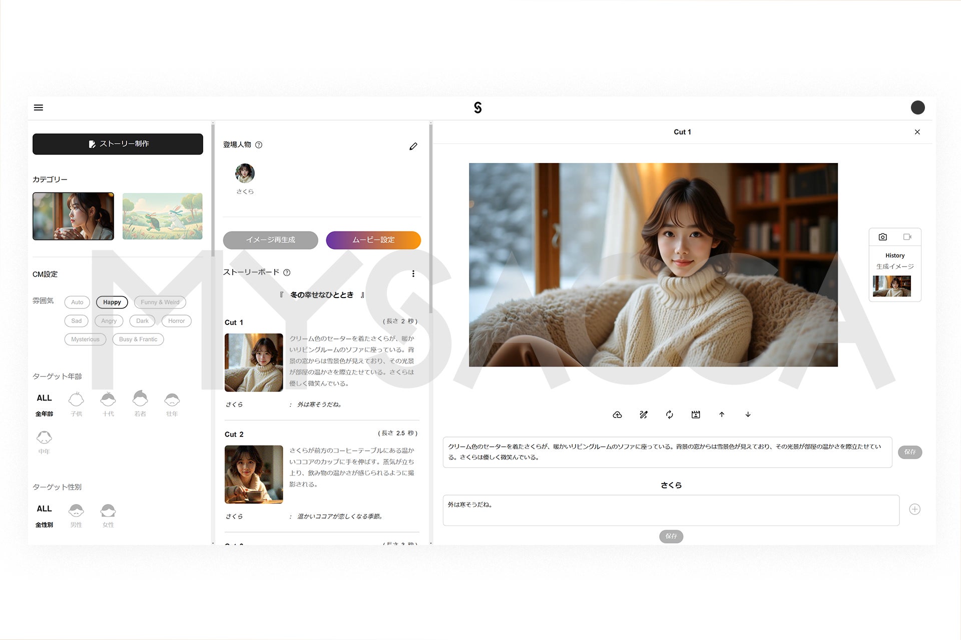 アイデアを入れるだけで、画像、映像だけでなく、基礎となるストーリー、ナレーション、ボイス、BGMまで、誰でも簡単に、一括で生成できるAI映像制作ツールです。