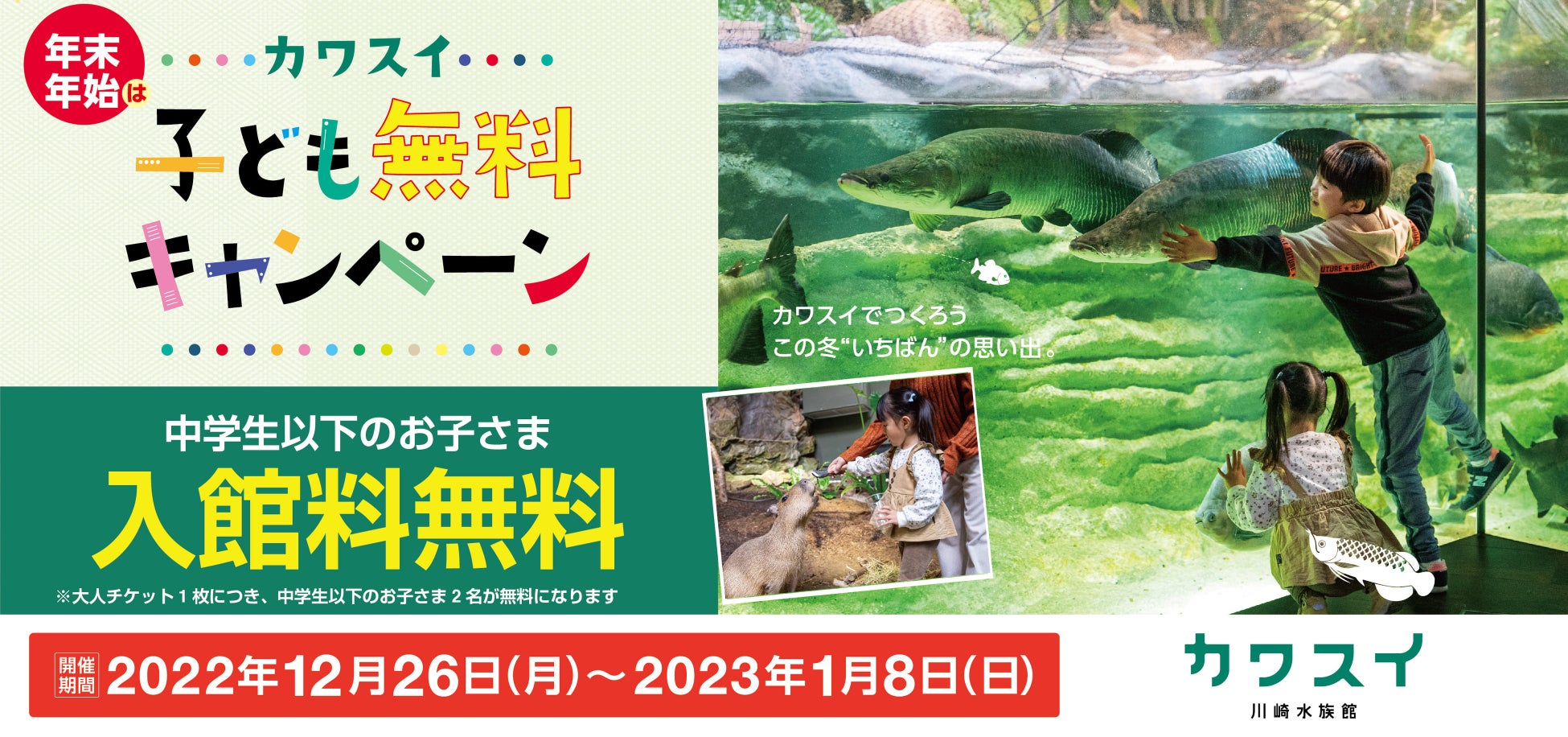 カワスイ 川崎水族館(所在地:神奈川県川崎市、館長:岩岡千香子、以下カワスイ)では、2022年12月26日(月)~2023年1月8日(日)の期間、「カワスイ 子ども無料キャンペーン」第2弾の開催が決定いたしました。期間中は、お子さまとご家族がよりカワスイをお楽しみいただけるようなコンテンツを、盛りだくさんでご用意いたします。