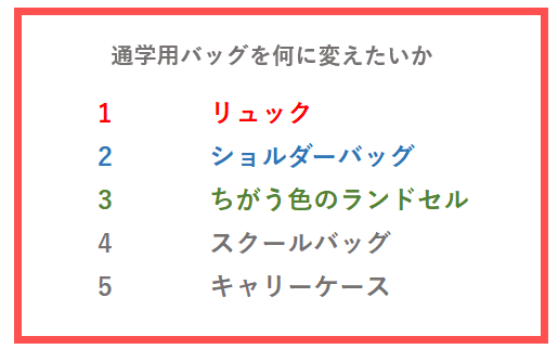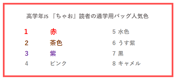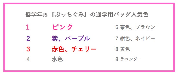 ② 愛用中のバックの色ランキングを公開。低学年JSは「ピンク」、高学年JSは「赤」が人気No.1
