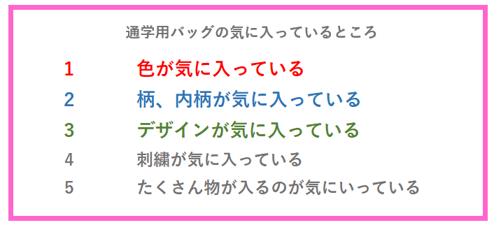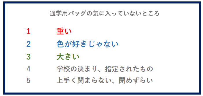また、「気に入っていないポイント」では「重さ」という回答が多数。バッグ自体の重さもあれば、教材などがたっぷり入るため、成長中のJSたちにとっては特に重たく感じているのかもしれません。
