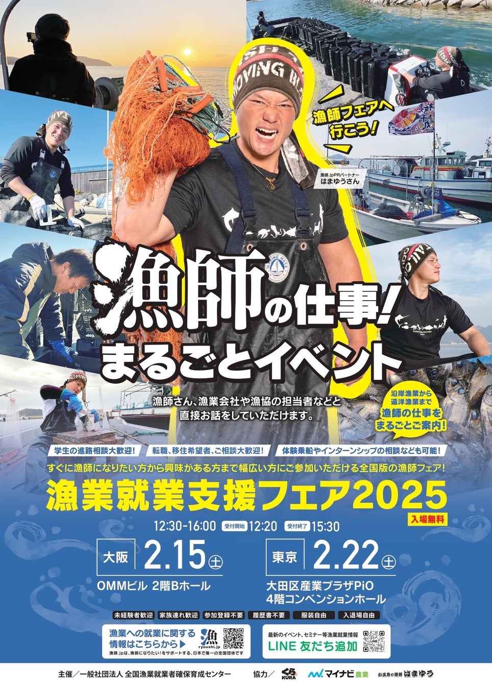 日本人の漁師の担い手確保・育成を目的に活動をしている、一般社団法人全国漁業就業者確保育成センター(以下「漁師.jp」)(代表理事会長:小坂智規 所在地:品川区上大崎)は、2月15日(土)大阪、2月22日(土)東京で漁業就業支援フェア(漁師フェア)を開催します。
