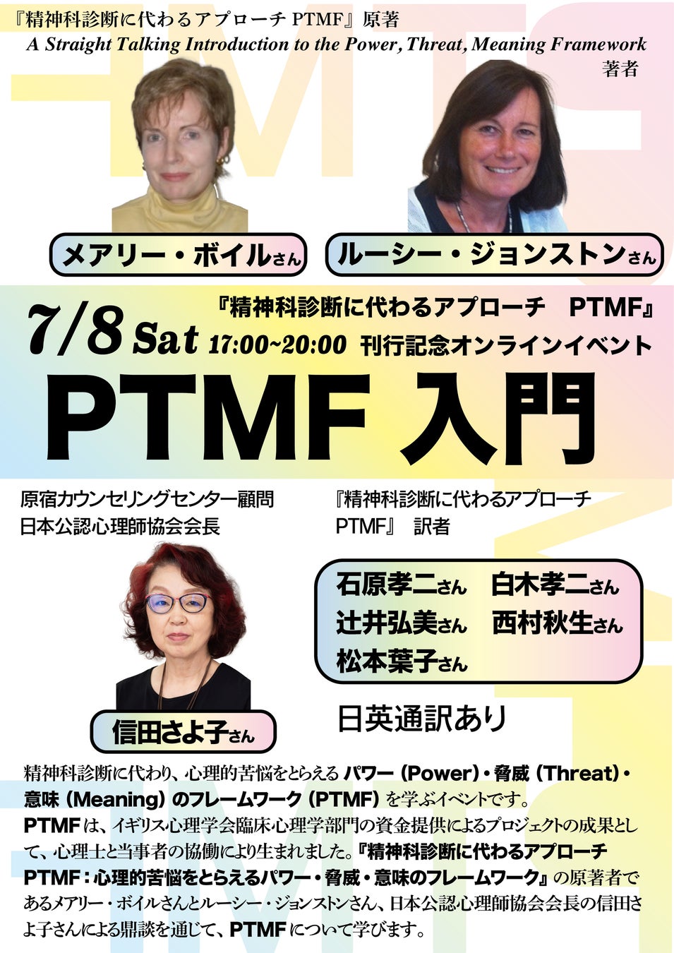 PTMFは,イギリス心理学会臨床心理学部門の資金提供によるプロジェクトの成果として,心理士と当事者の協働により生まれました。『精神科診断に代わるアプローチ PTMF:心理的苦悩をとらえるパワー・脅威・意味のフレームワーク』の著者であるメアリー・ボイルさんとルーシー・ジョンストンさん,日本公認心理師協会会長の信田さよ子さんによる講演・鼎談を通じてPTMFについて学びます。