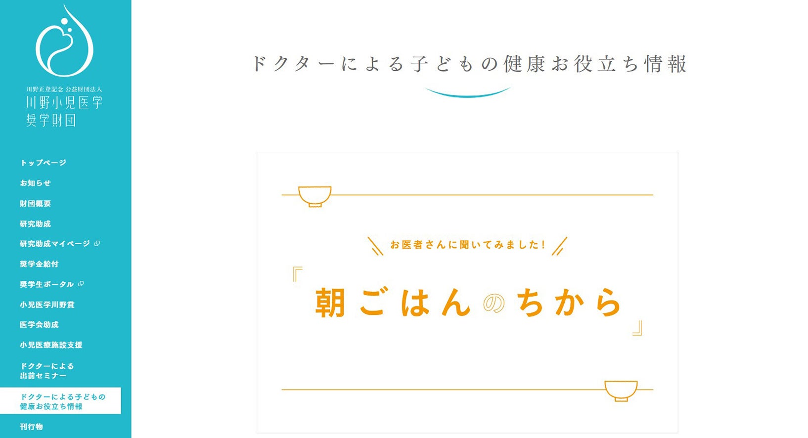 小児医学・医療・保健の発展を支援する公益財団法人川野小児医学奨学財団(所在地:埼玉県川越市、理事長:川野幸夫/株式会社ヤオコー代表取締役会長)は、当財団ウェブサイト内「ドクターによる子どもの健康お役立ち情報」の新たなコンテンツとして、『朝ごはんのちから』を2月6日に公開しました。