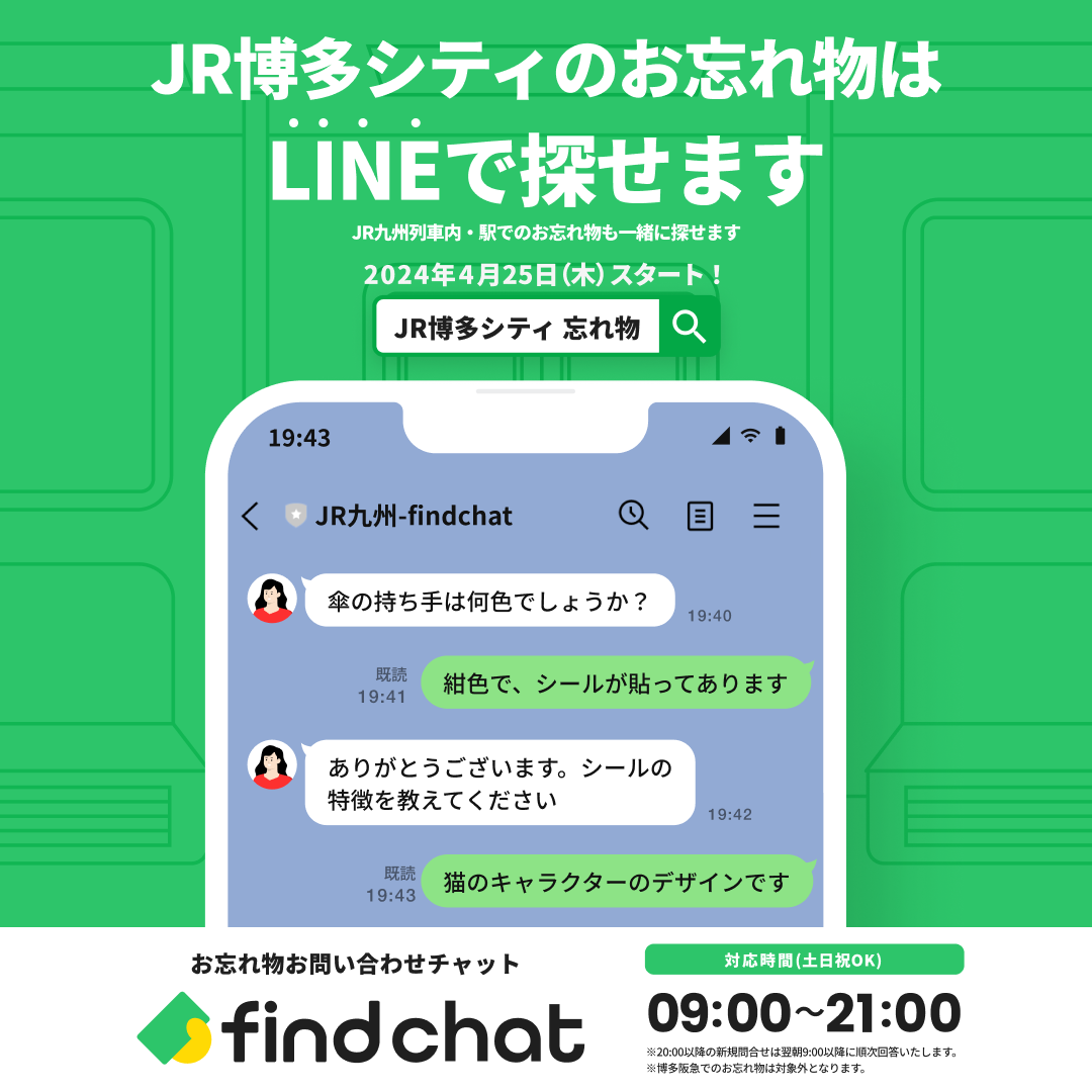 find導入により、お客さまはJR博多シティでのお忘れ物をLINE から24時間お問い合わせいただけます。