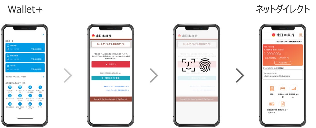 北日本銀行公式アプリ「Wallet+」からネットダイレクトへログインする際は、生体認証(指紋や顔認証)のみでログインが完了します。