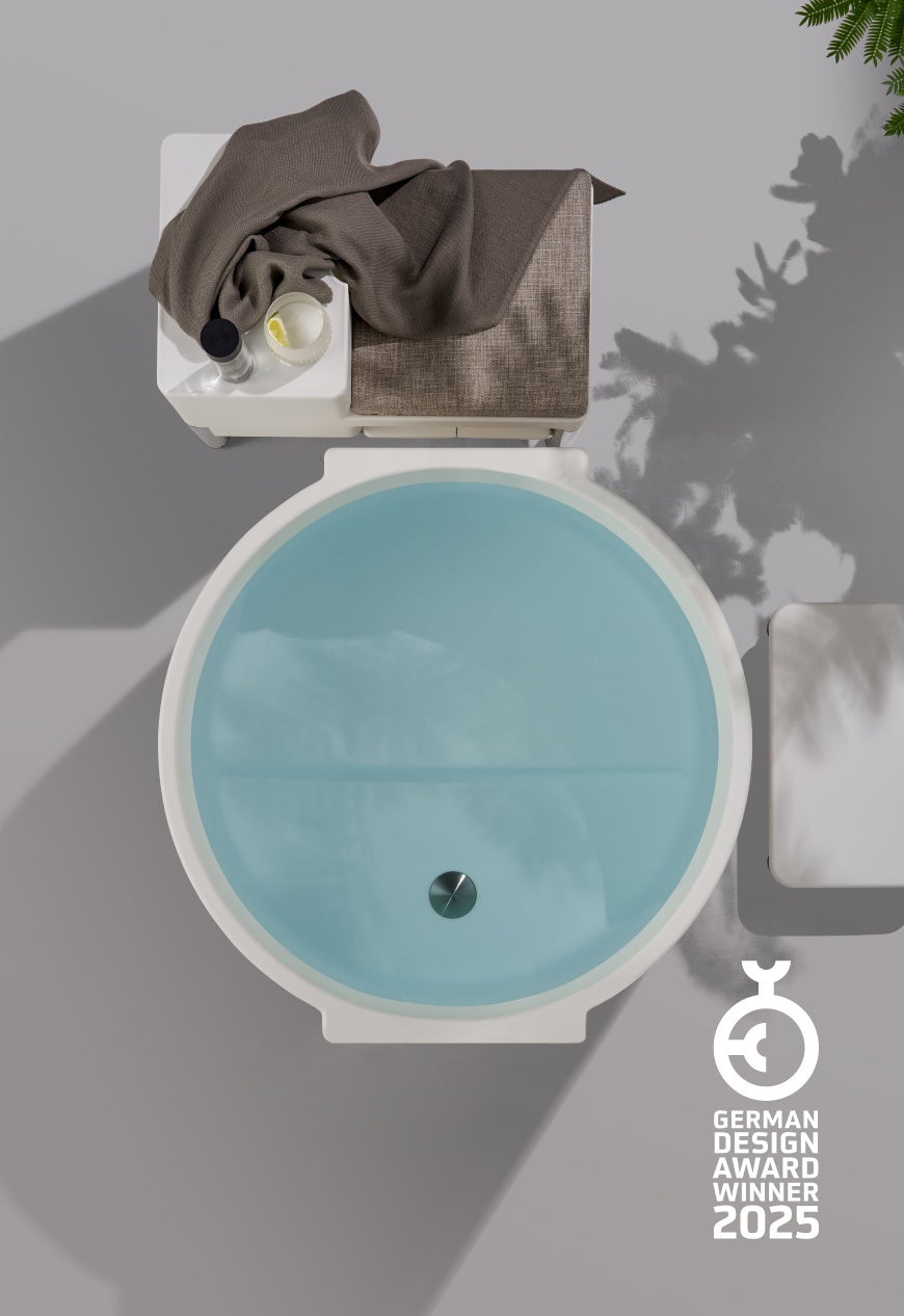 円と直線のデザイン要素を巧みに融合し、2つの異なる入浴体験を提供するバスタブ。半身浴用のシートが、ゆったりとしたリラックスと節水を促進する。サステナブル素材 Cristalplant®を使用し、美しさと環境への配慮を調和させている。