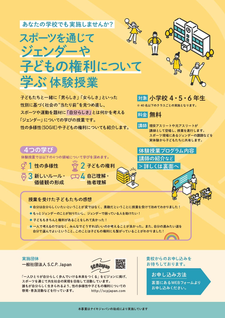 一般社団法人S.C.P. Japan(以下「S.C.P. Japan」)では、2023年度よりナイキジャパンからのサポートを受け、「スポーツを通じてジェンダーや子どもの権利について学ぶ体験授業」を実施