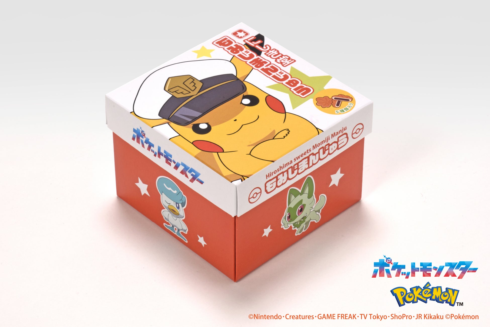 キャプテンピカチュウやニャオハ、ホゲータ、クワッスなどのポケモンたちが描かれたパッケージの中には、バリエーション豊かな5種のもみじ饅頭が入っています。
