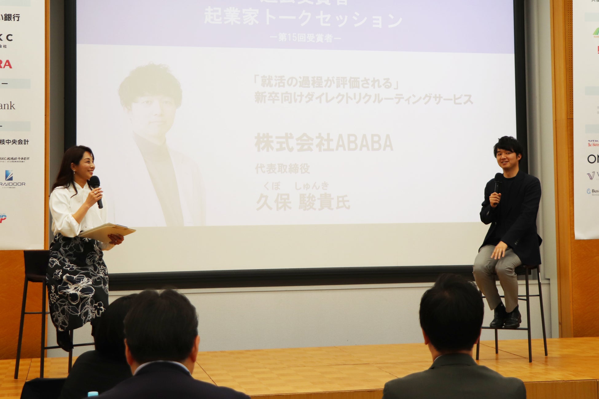 最終プレゼンテーション終了後、受賞者が決定するまでの審査時間を活用して、会場では過去の受賞者によるトークセッションを実施。ゲストには、株式会社ABABA 代表取締役 久保 駿貴氏(第15回受賞者)にご登壇いただき、起業間もない時に受賞され、新たな採用のカタチを提案することの苦労や事業成長の軌跡についてお話しいただきました。