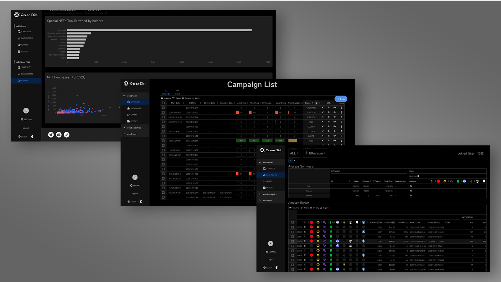 「Ocean Dict.」は、web3に特化したマーケティングSaaSで、web3に特化した申し込みフォームである「web3 form」およびマルチチェーン対応でトランザクションデータ解析が可能な「web3 analytics」の2つの機能を提供しています。