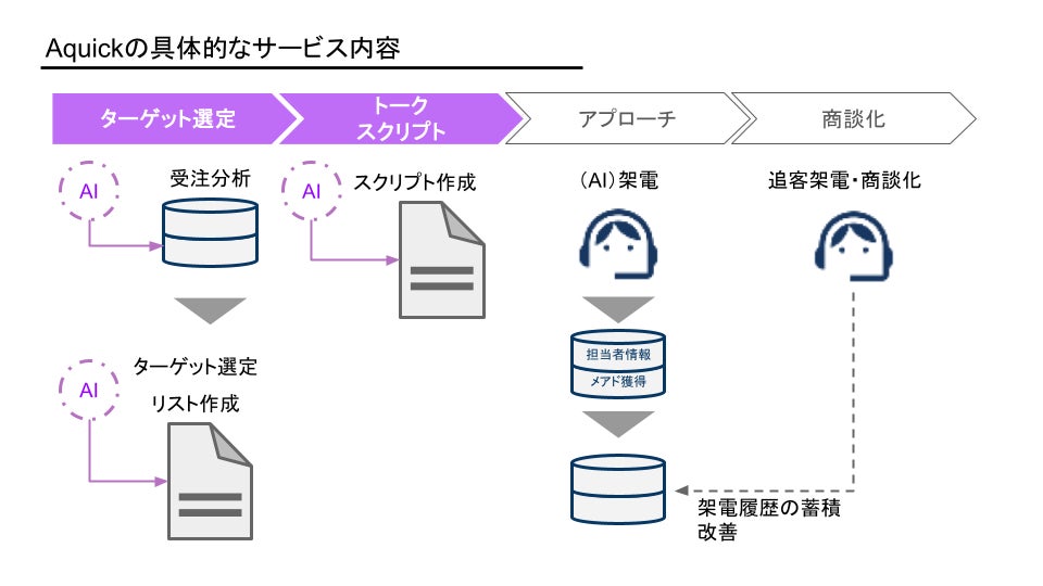 「Aquick」は、「知見とAIを生かした分析業務」をコンセプトとするサービスです。具体的なサービスフローは以下の通りです。