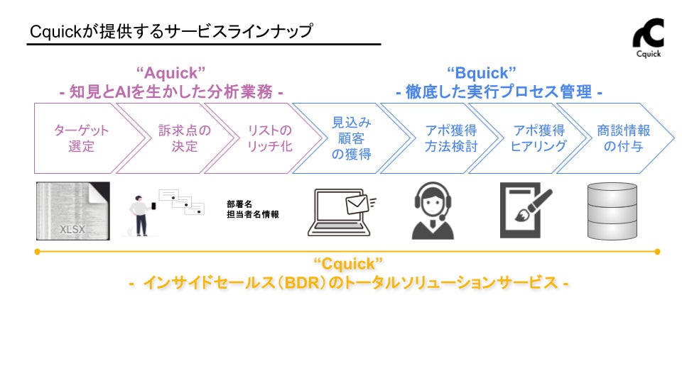 Cquickは、「Bquick(実行プロセス管理支援)」、「Cquick(トータルソリューション)」といったサービスラインナップとともに、企業の営業活動におけるあらゆる課題解決を目指し、事業を展開してまいります。