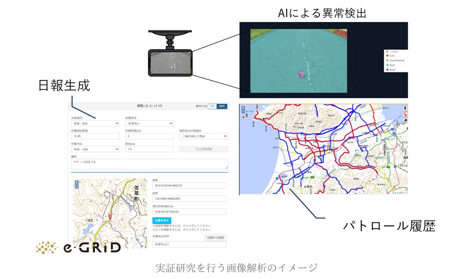 出雲市より発表された「官民連携による地域課題解決検討プロジェクト」の道路パトロールのDX化の分野において、e-GridはAI画像解析を活用し道路上の異常検出を行う実証実験を、出雲市の管理する道路で行います。