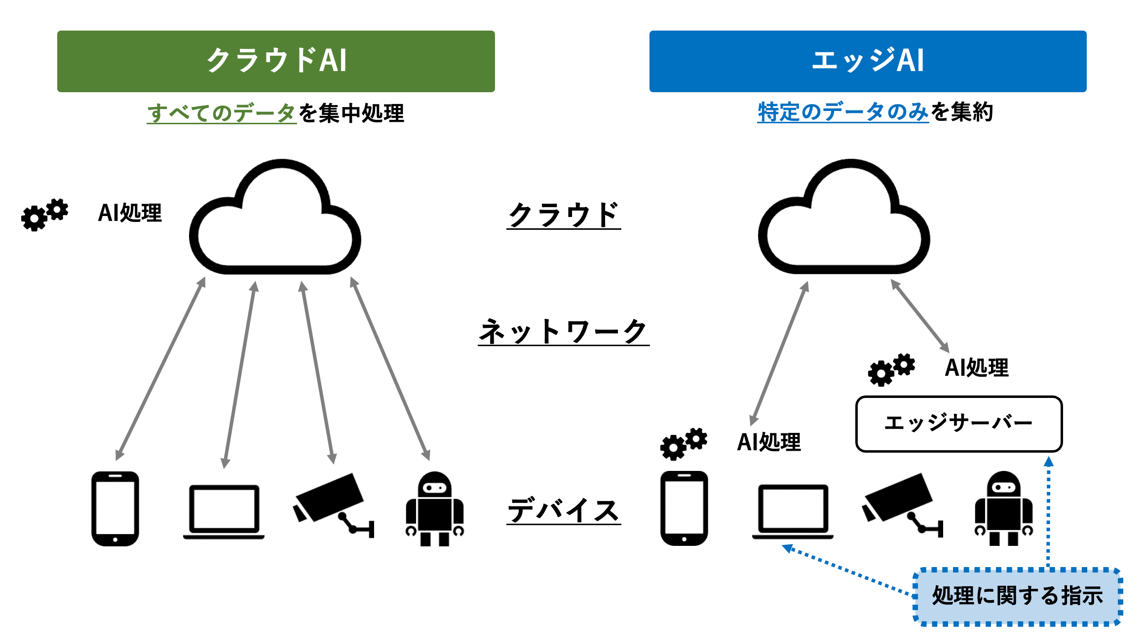 「エッジAI」とは、データ処理をローカルネットワーク上で行い、必要なデータのみをクラウドに送信する技術です。カメラやタブレットなどのデバイスに対し、「どのようなデータを、どのように判断するか」を指示し、デバイス上でデータ処理を行います。その結果、必要なデータのみをクラウドに送信するため、負荷が少なく高速でデータ処理が可能となり、コストの削減にもつながります。