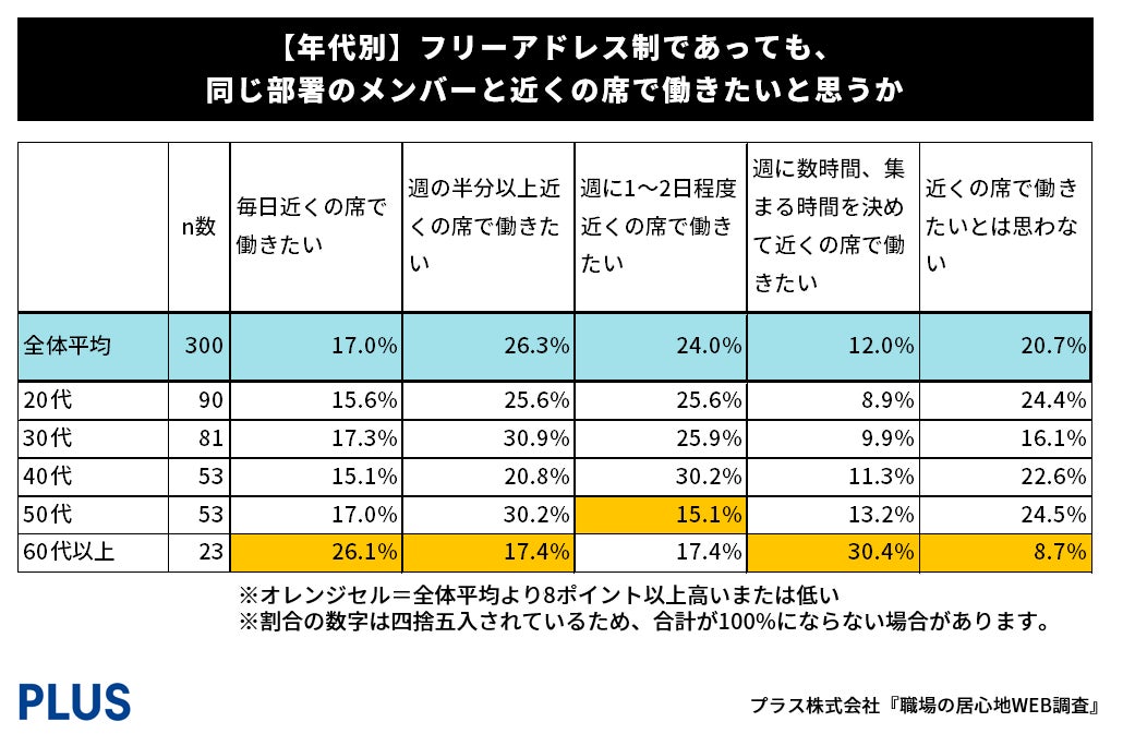 一方、年代別では差が出ており、60代以上で「毎日近くの席で働きたい」が全体より9.1ポイント高く、「近くの席で働きたいとは思わない」が12.0ポイント低い結果となりました(下図参照)。