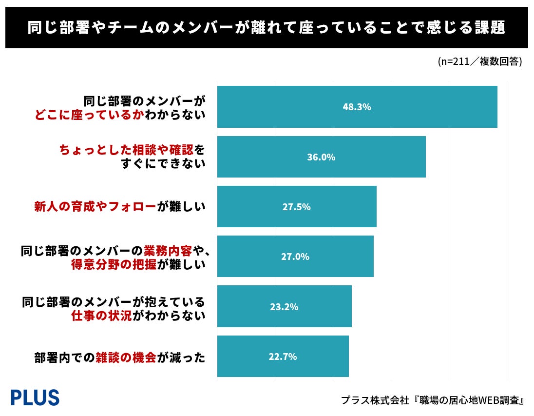 課題を感じたことが「ある」と回答した211人について、課題の内訳を見ていくと、「同じ部署のメンバーがどこに座っているかわからない」が48.3%で最も多く、次に「ちょっとした相談や確認をすぐにできない」「新人の育成やフォローが難しい」と続きました。