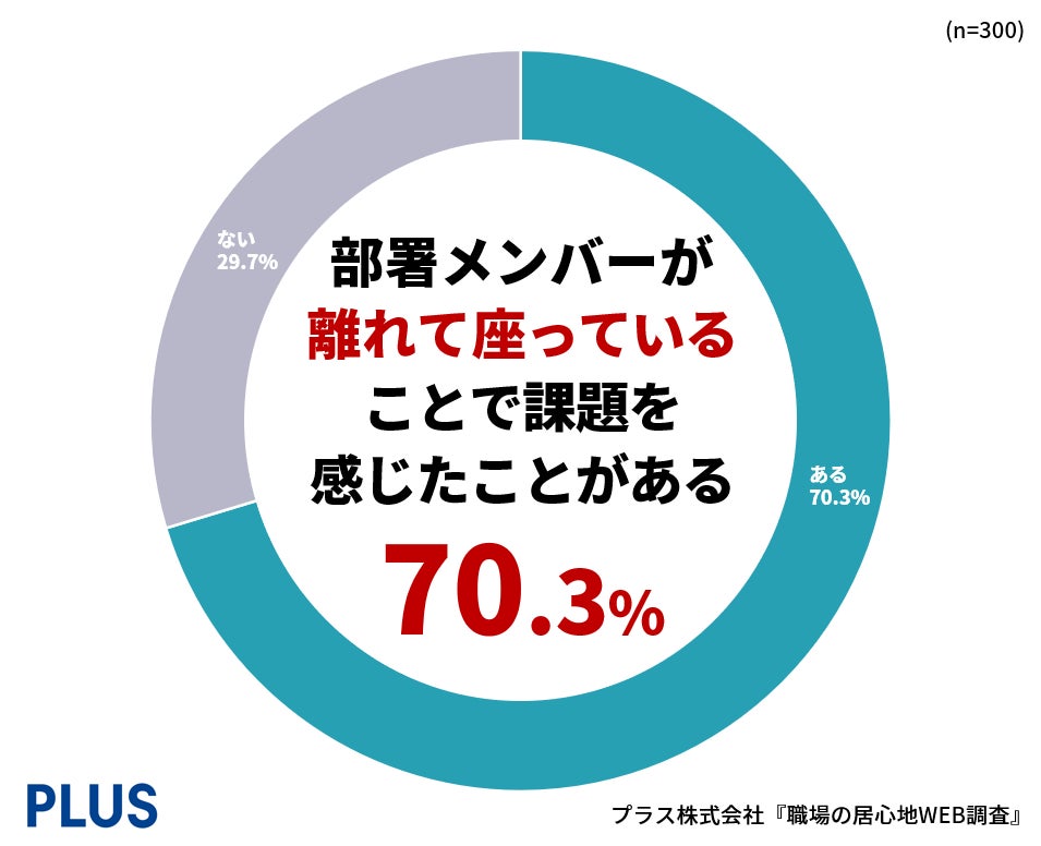 フリーアドレスオフィスで働いている人/働いた経験のある人300名を対象に、「部署やチームのメンバーが離れて座っている」ことによる課題を感じたことがあるかを尋ねたところ、70.3%が「ある」と回答しました。次に、課題の内訳を見ていきます。