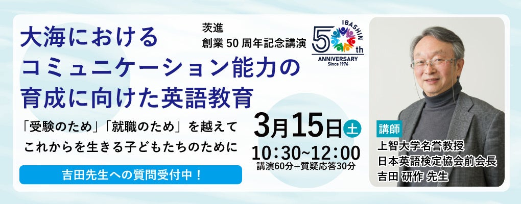 市進教育グループ 株式会社茨進(本社:茨城県土浦市、代表取締役社長:水野徹)では、2025年度に創業50周年を迎えます。そこで、創業50周年の感謝を込めて、3月15日(土)、上智大学名誉教授 吉田研作先生をお迎えし、記念講演を開催します。当講演会の申込受付を2月1日(土)より開始致します。