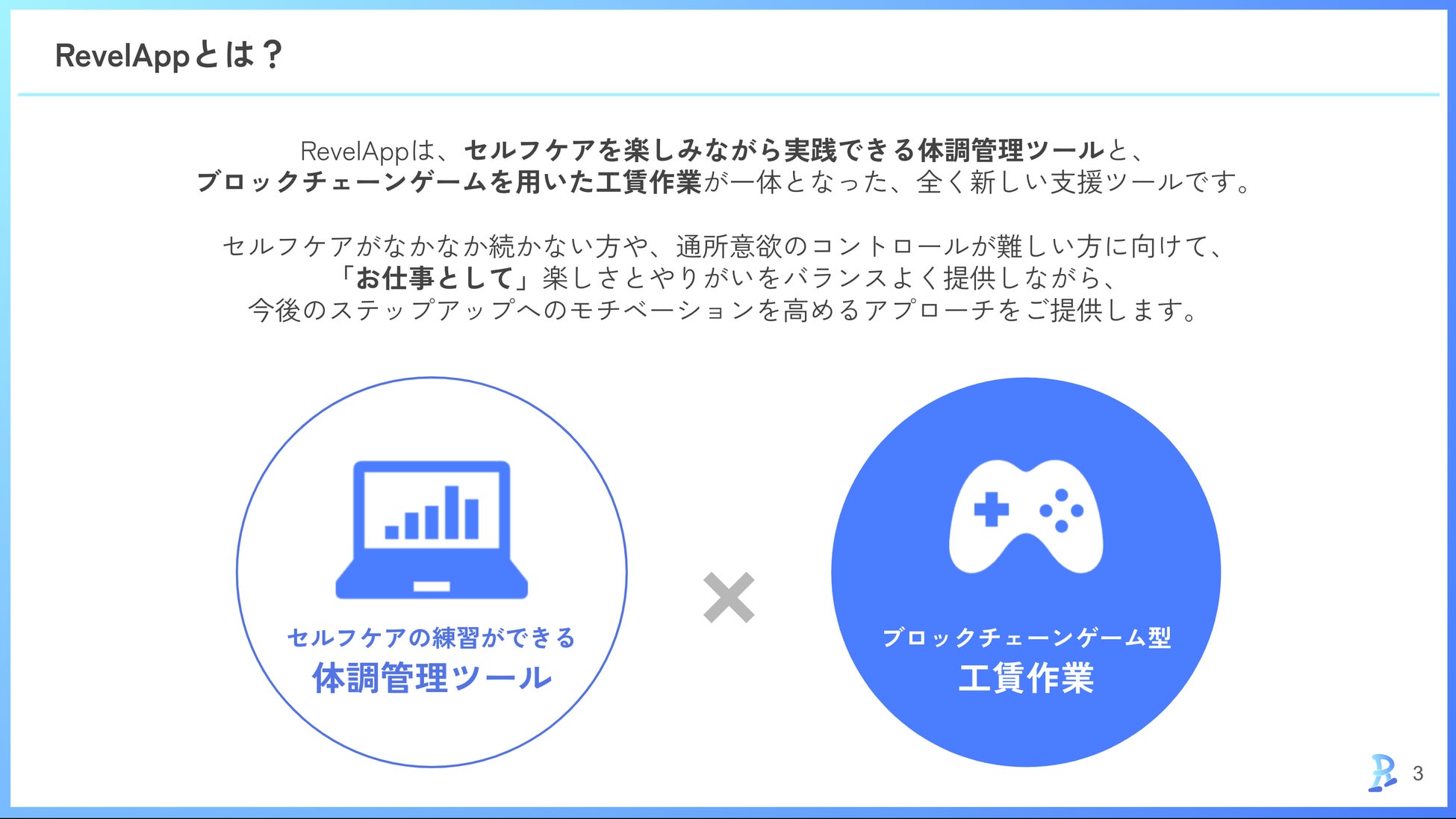 ブロックチェーンゲーム型の工賃作業と、独自に開発した体調管理記録シートの記入とをセットでご提供する、福祉業界初のモデルとなるWebサービスです。