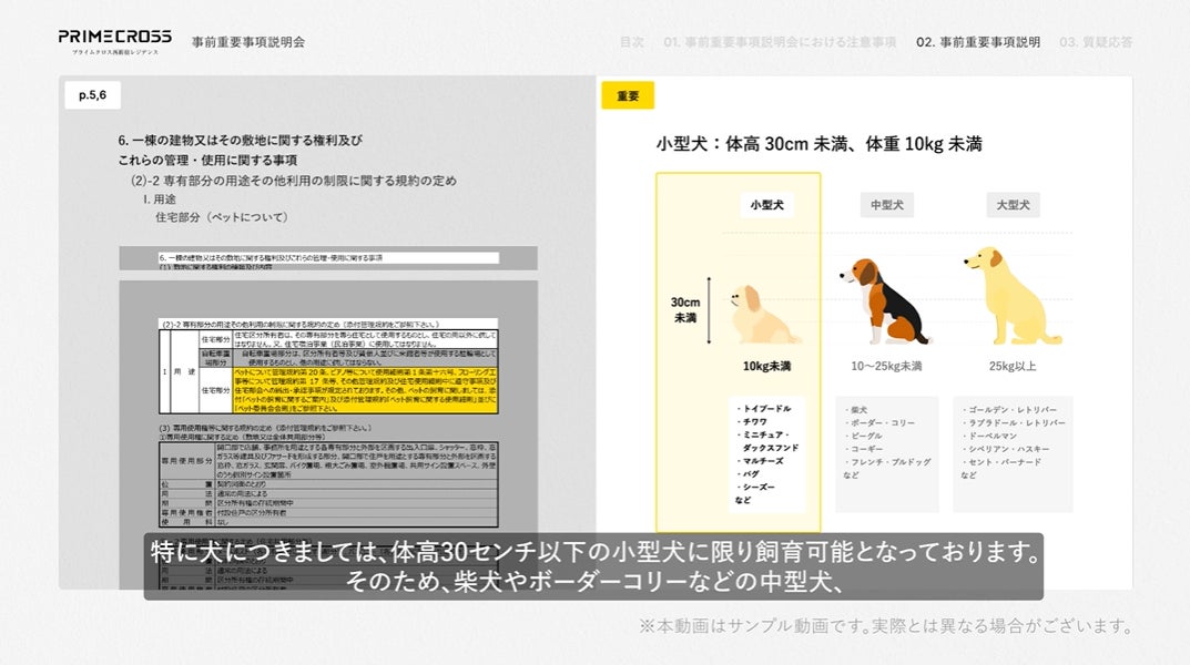 例えば、物件ごとに異なるペット飼育条項の説明パートにおいては、具体的な犬種のイラストやサイズ表記を併記することで、当該物件で飼育可能なペットの犬種をお客様にご説明します。