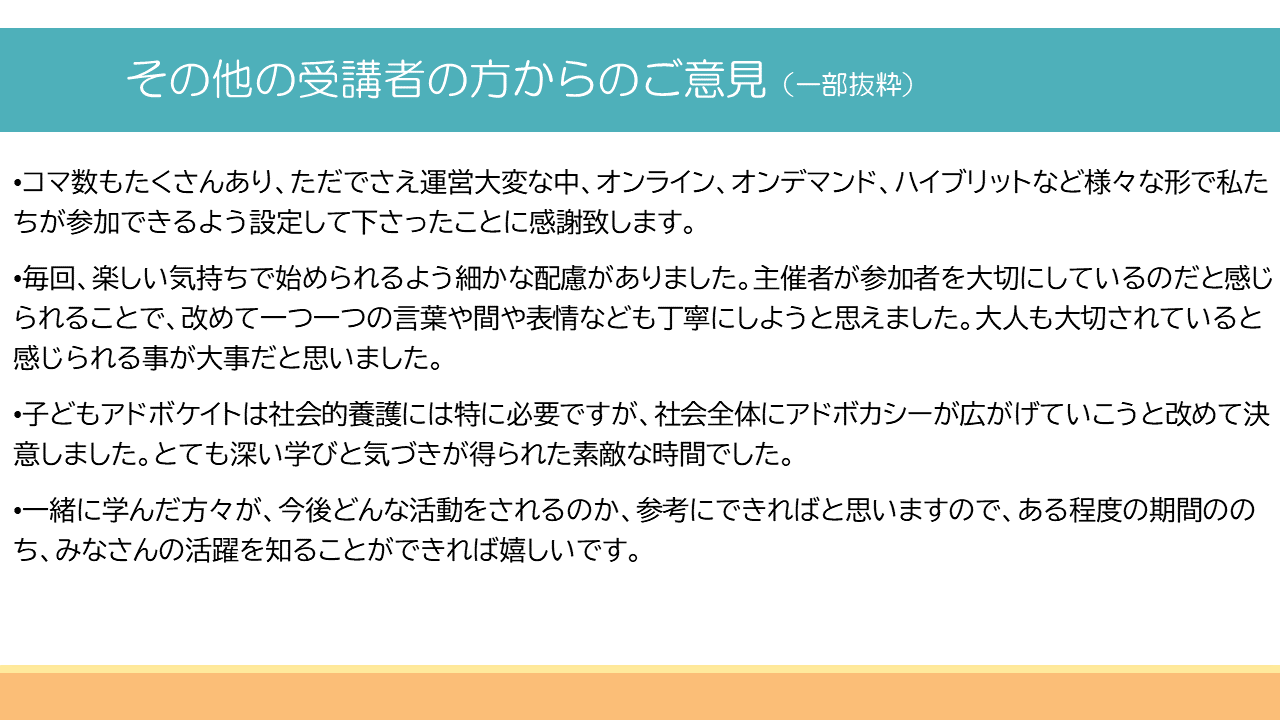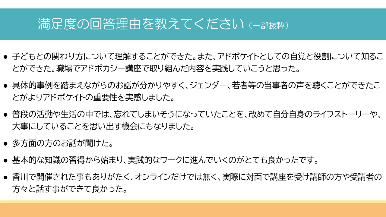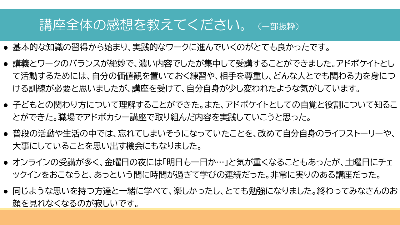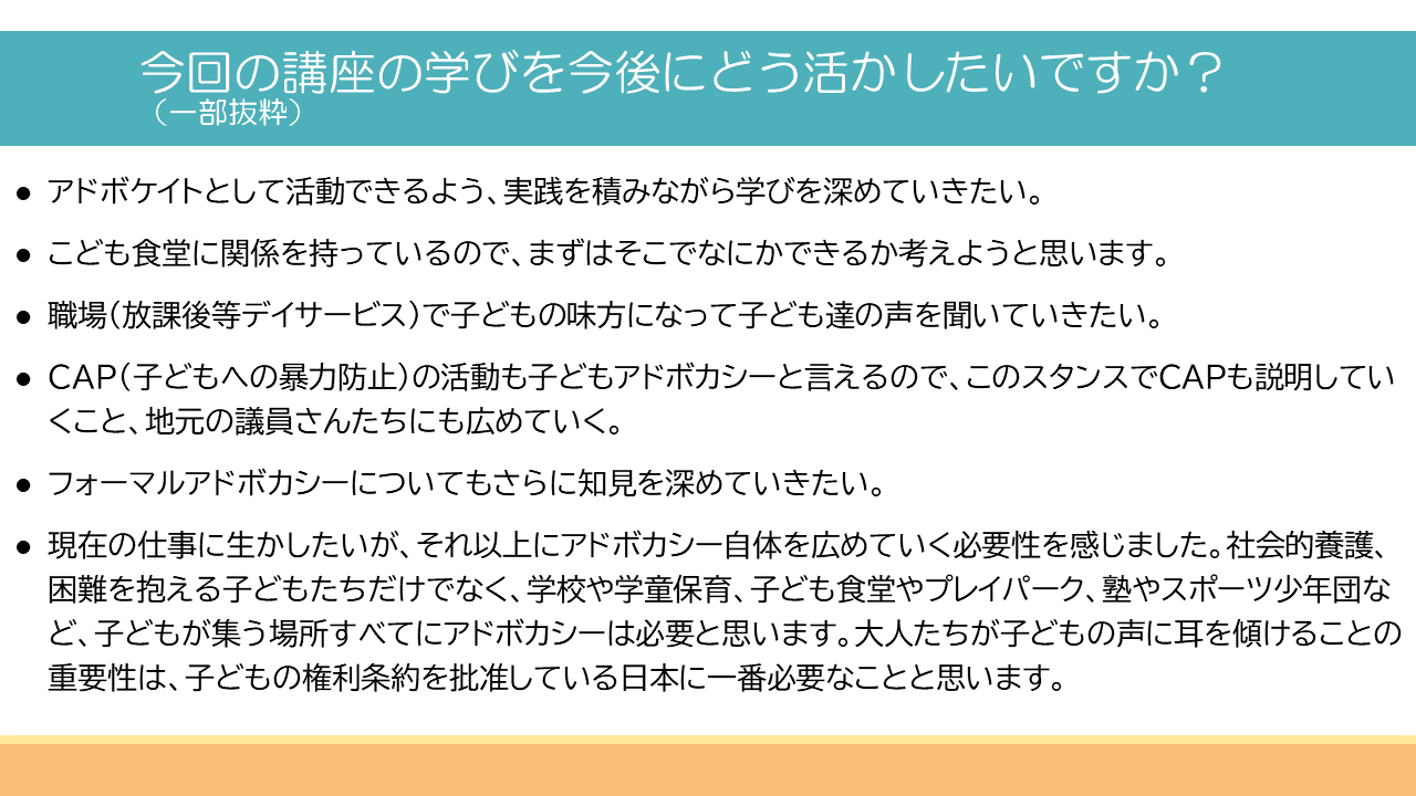 ・子どもとの関わり方について理解することができた。また、アドボケイトとしての自覚と役割について知ることができた。職場でアドボカシー講座で取り組んだ内容を実践していこうと思った。