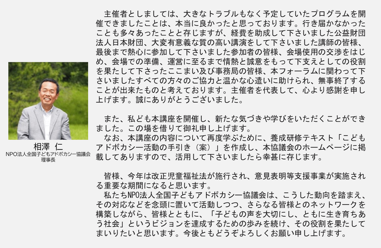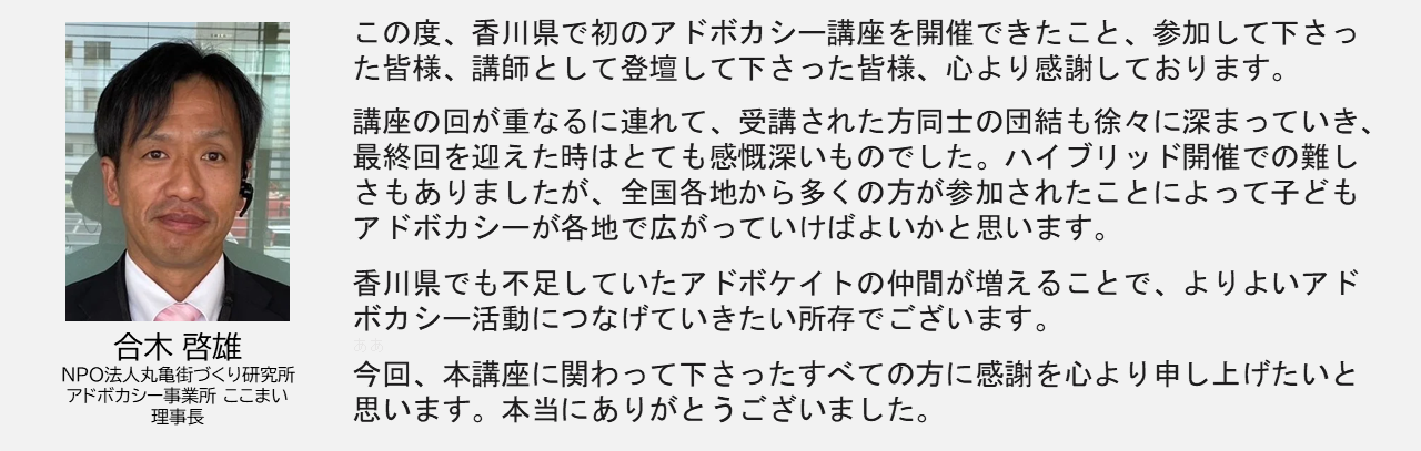 香川県での本講座のプログラムを企画し、トレーナーとしても本講座運営に携わった当協議会 理事長の相澤 仁からのコメントを紹介いたします。