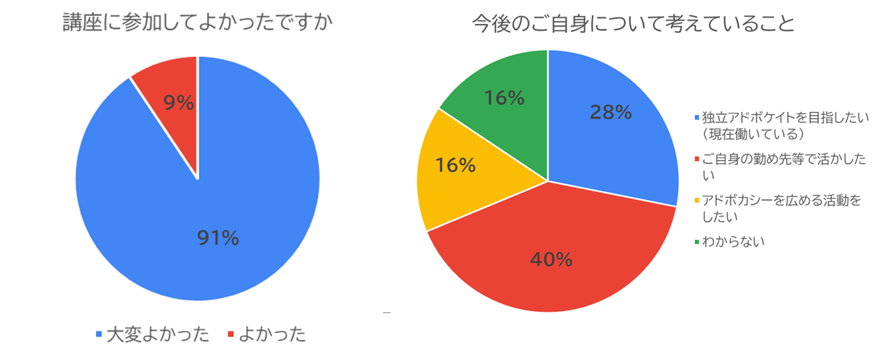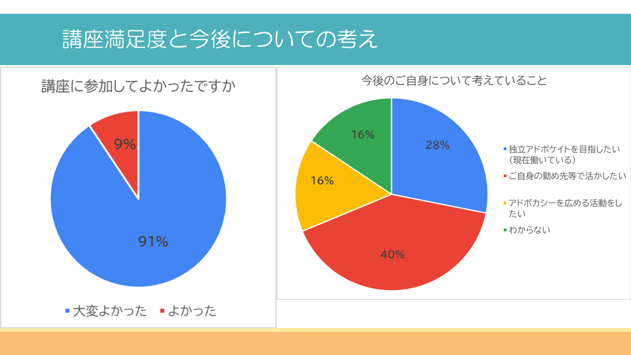 ・アドボケイトとして活動できるよう、実践を積みながら学びを深めていきたい。