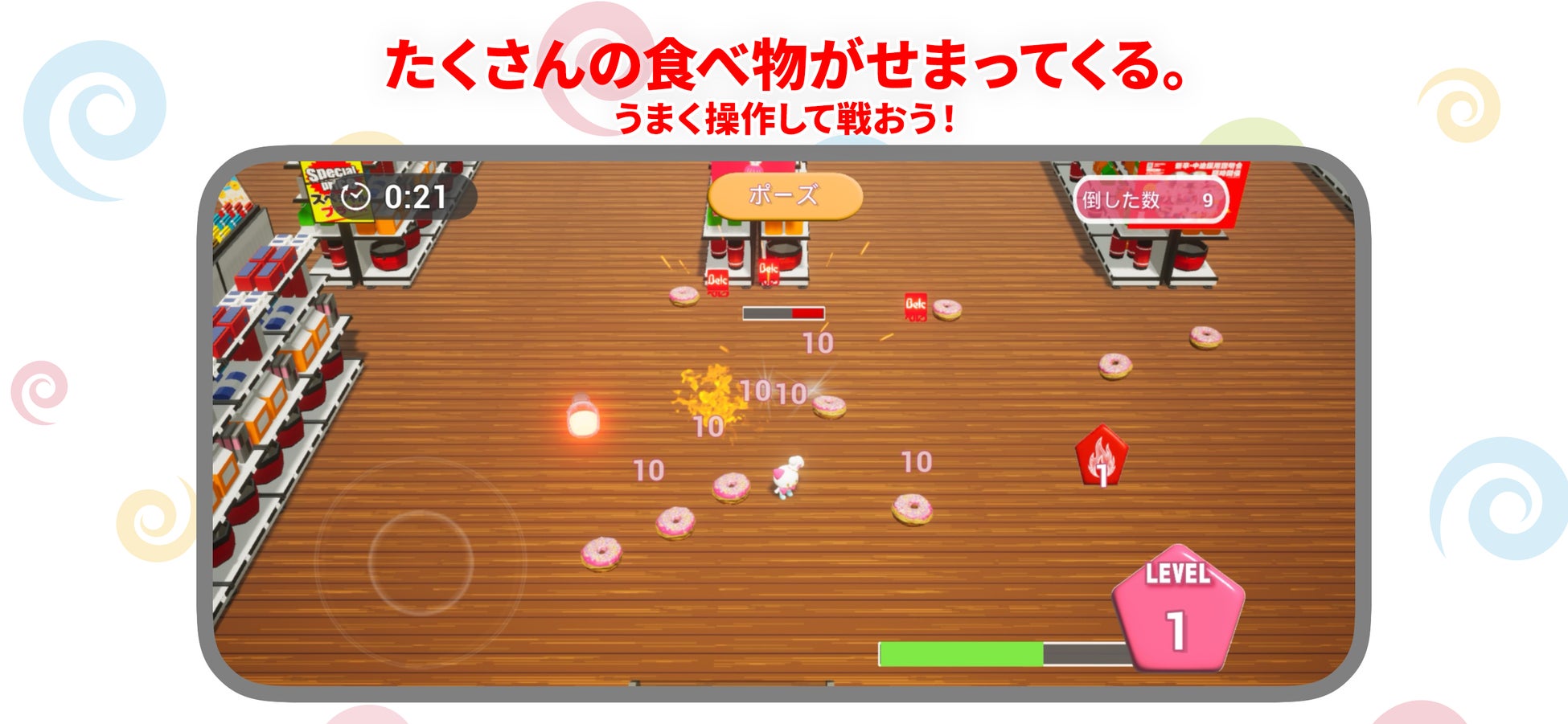 とスコアを獲得できます。どんどん勢いを増す食べ物たちを相手に、制限時間(5 分間)の最後まで守り抜き、ハイスコアを目指しましょう。