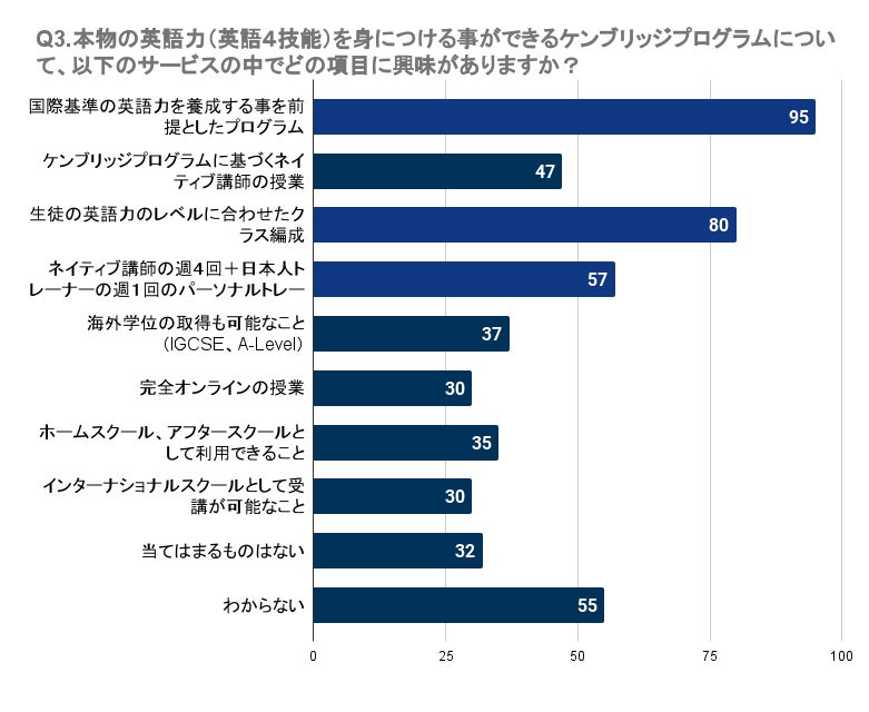 Q3で「本物の英語力(英語4技能)を身につける事ができるケンブリッジプログラムについて、以下のサービスの中でどの項目に興味がありますか?(複数回答可)」と質問したところ、京都府で最も多かったのは「国際基準の英語力を養成する事を前提としたプログラム」で95名でした。次いで、「生徒の英語力のレベルに合わせたクラス編成」には80名、「ネイティブ講師の週4回+日本人トレーナーの週1回のパーソナルトレーニング」には57名が興味を持っています。一方で、「完全オンラインの授業」や「インターナショナルスクールとして受講が可能なこと」に関心を持つ人はやや少なめで、30名の回答でした。これらの結果から、多くの人は実用的な英語力の養成や個別のニーズに応じた指導に重きを置いていることが伺えます。
