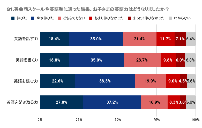 Q1で「英会話スクール、英語塾に通った結果、お子さまの英語力はどうなりましたか?」と質問したところ、京都府では英会話スクールや塾に通って英語のスキル向上を明確に感じられなかったと感じている人が一定数いることが分かりました。具体的には、英語を話す、書く、読む、聞き取る各スキルにおいて、「伸びた」と感じる人は約18%~28%であり、一方で「あまり伸びなかった」や「まったく伸びなかった」と回答した人が合わせて約12%〜19%となっています。特に、「英語を話す力」と「英語を書く力」においては「あまり伸びなかった」と「まったく伸びなかった」の合計がそれぞれ18.8%、15.8%となっています。また、各スキルに関して「どちらでもない」と答えた人も含めると、約30%~40%となっており、明確な効果を実感していない人が一定数存在することが伺えます。