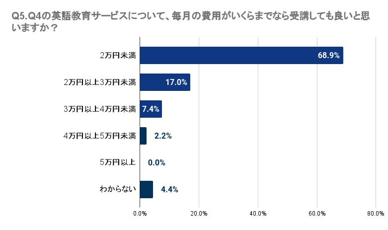 Q4で「受講したい」「料金が安ければ受講したい」「興味がある」と回答した人に、Q5で、「Q4の英語教育サービスについて、毎月の費用がいくらまでなら受講しても良いと思いますか?」と質問したところ、最も多い68.9%の回答者は2万円未満が適切と感じています。17.0%は2万円以上3万円未満、7.4%は3万円以上4万円未満と答えました。対照的に、4万円以上の費用を考える回答者は極少数で、4万円以上5万円未満が2.2%、5万円以上が0.0%でした。これにより、京都府では多くの人が3万円未満の価格帯を望んでいることが明らかとなりました。