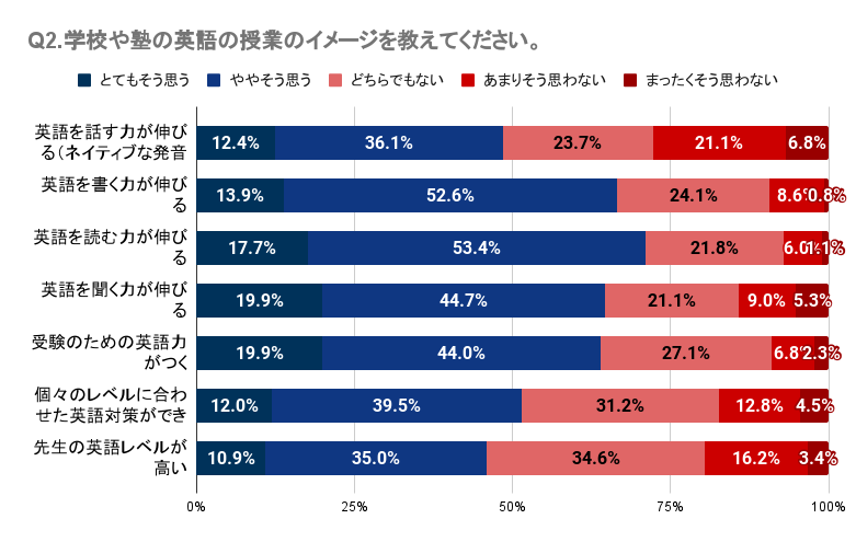 Q1・Q2では、子どもが英会話スクールや英語塾に通っていたが英語力アップの効果を感じていない人が一定数いること、学校や塾の英語の授業に対して明確な効果や良い印象を持てていない人が多いことが明らかになりました。