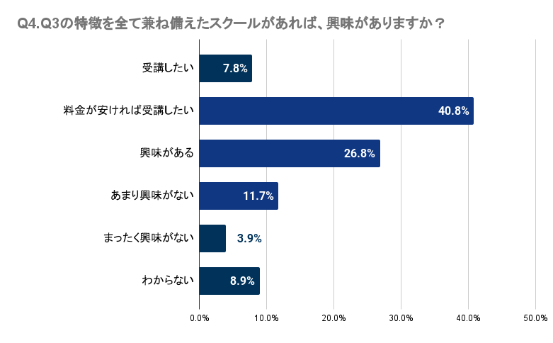 Q4で「Q3の特徴を全て兼ね備えたスクールがあれば、興味がありますか?」と質問したところ、京都府では7.8%が受講を希望し、40.8%は料金が手頃であれば受講したいと考えています。さらに、26.8%は興味を示していると回答しました。多くの人がこのような特徴を持つスクールに一定の興味を示していることが分かります。
