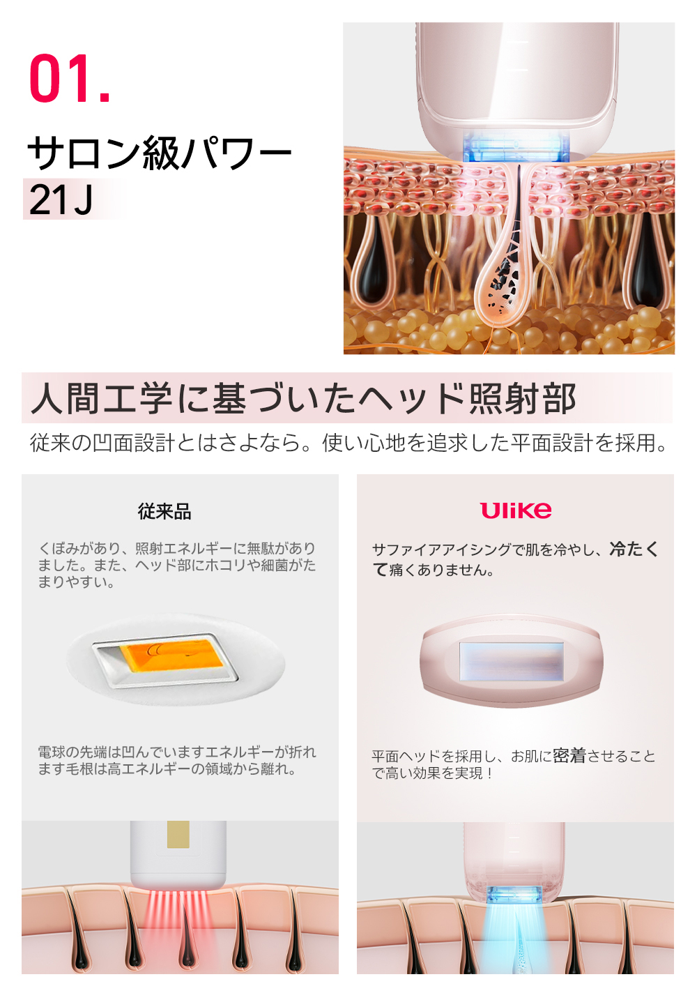 ▼特徴1|21ジュールの出力エネルギーで、自宅でサロン級ムダ毛処理