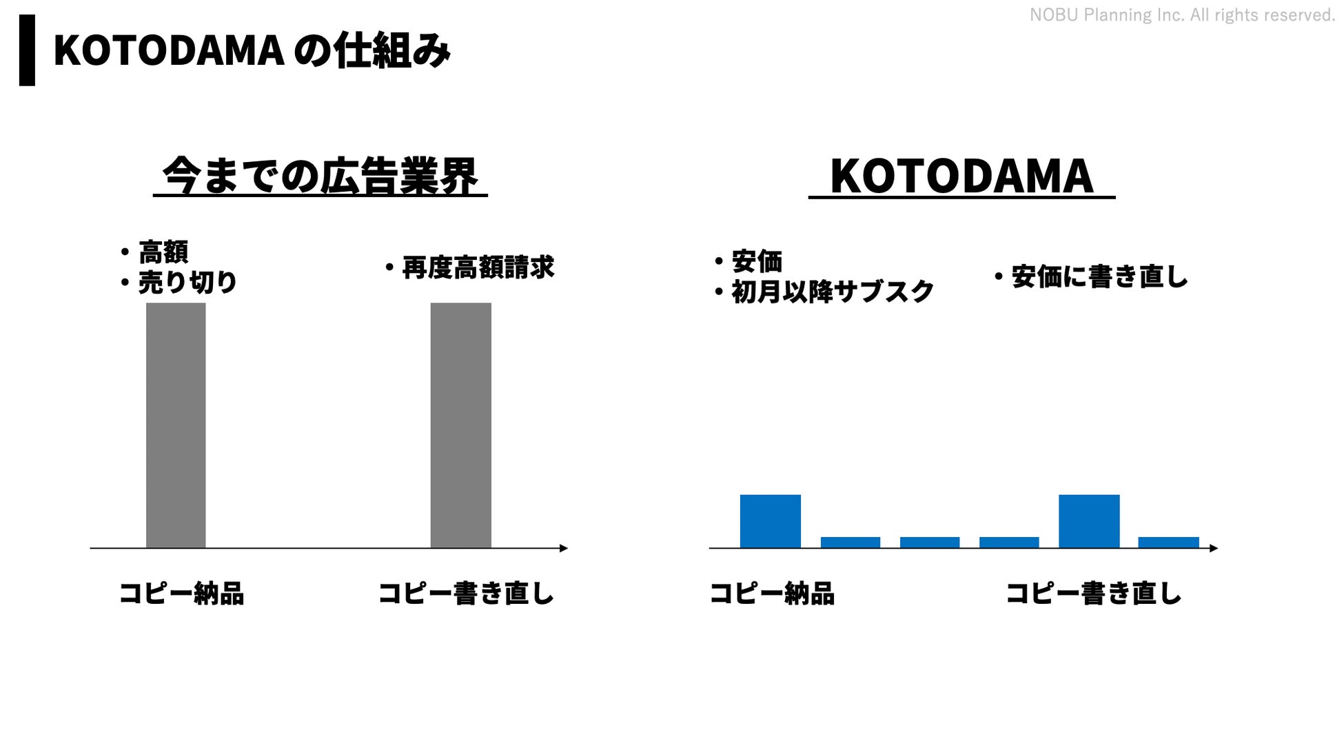 「KOTODAMA(コトダマ)」は、上記調査で明らかになった課題を解決できるサービスです。クリエーティブ・マーケティング・広報におけるの初期の言語化や戦略策定の費用を抑えることができ、クリエーティブの使用期間中のみサブスクで費用が発生する、広告クリエーティブ・コピーライティングのサブスクリプションサービスです。電通出身のコピーライターが、クリエーティブの質は担保しながら、AIを導入することで、導入・活用しやすいサービスとして開発しました 。