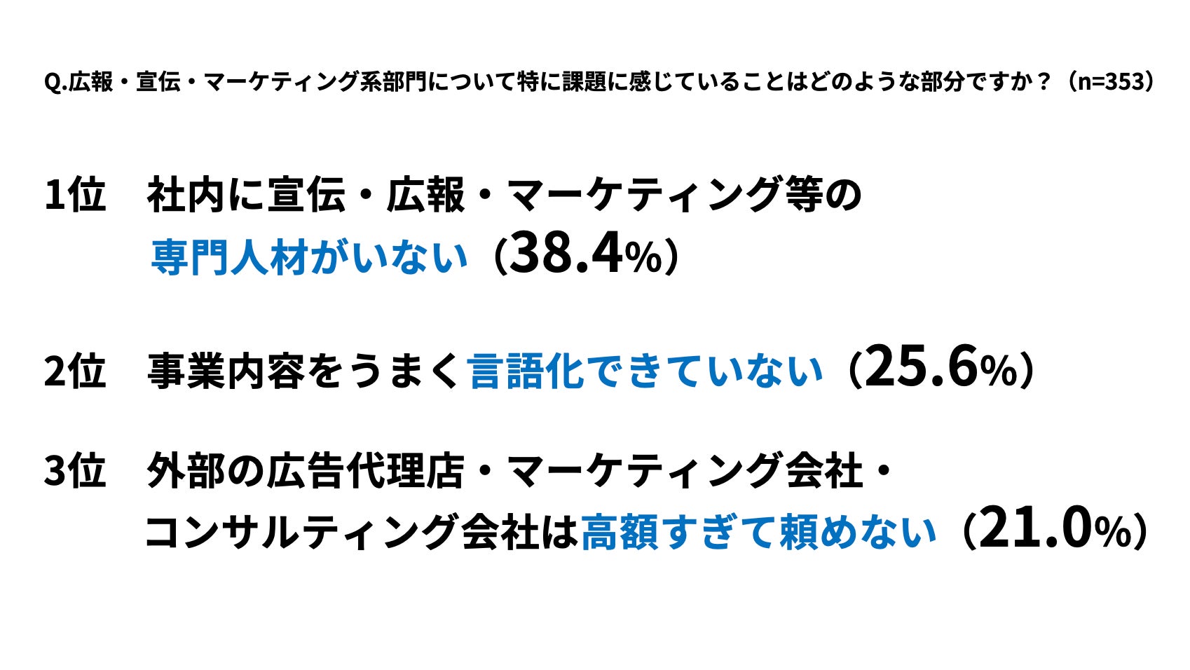 さらに、上記の3部門において会社として課題があると回答した経営者に対して、特に課題と感じる部分を質問したところ、「社内に専門人材がいない」、「事業内容の言語化ができない」、「外部支援会社は高額すぎて頼めない」などの課題が明らかになりました。