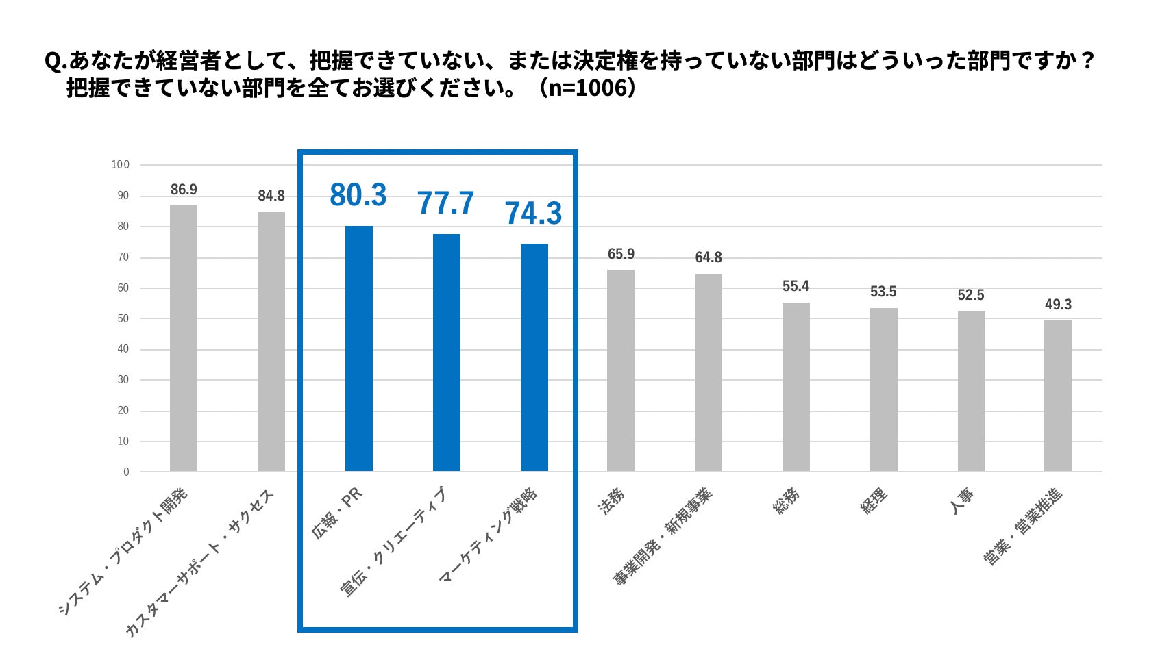 調査では、まず、経営者が把握できていない、または決定権を持っていない部門について質問を行いました。その結果、約8割の経営者が、「広報・PR」「宣伝・クリエーティブ」「マーケティング戦略」と言った部門の掌握ができていないことが明らかになりました。