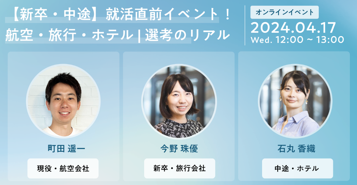 Reeluでは、求職者向けの接客業転職イベントを定期的に行ってまいります。第1回目は、現役客室乗務員、ホテル業界経験者、旅行会社経験者によるトークイベントを実施します。接客・ホスピタリティ領域ならではの就職活動準備について経験者が生の情報を語ります。新卒と中途両方が対象のイベントとなっておりますのでお気軽にご参加ください。