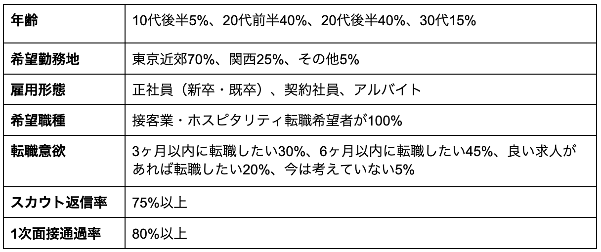 業界を問わず、接客・ホスピタリティに関わる業務の求人をお持ちの企業様が対象となります。上記に掲げた内容は一例ですので、ご関心をお持ちの方は、Reeluスタッフとの面談にて求人内容をお教えいただけたらと思います。求職者側のReelu登録ユーザーにつきましては、100%の方が接客・ホスピタリティ領域の転職を希望しています。